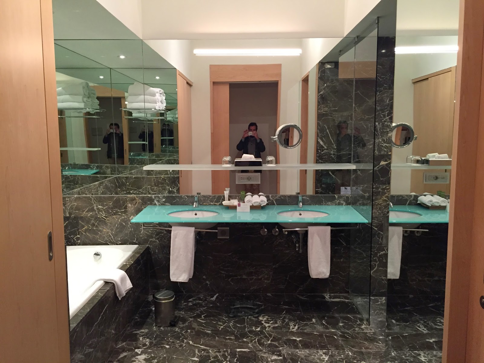 La habitación algo majestuoso. Donde sabes si un hotel es bueno o no es en el baño (y en mi caso también en la cama, de 2x2). Amplio, confortable y con vistas a los viñedos, ¡amanecer entre viñedos!