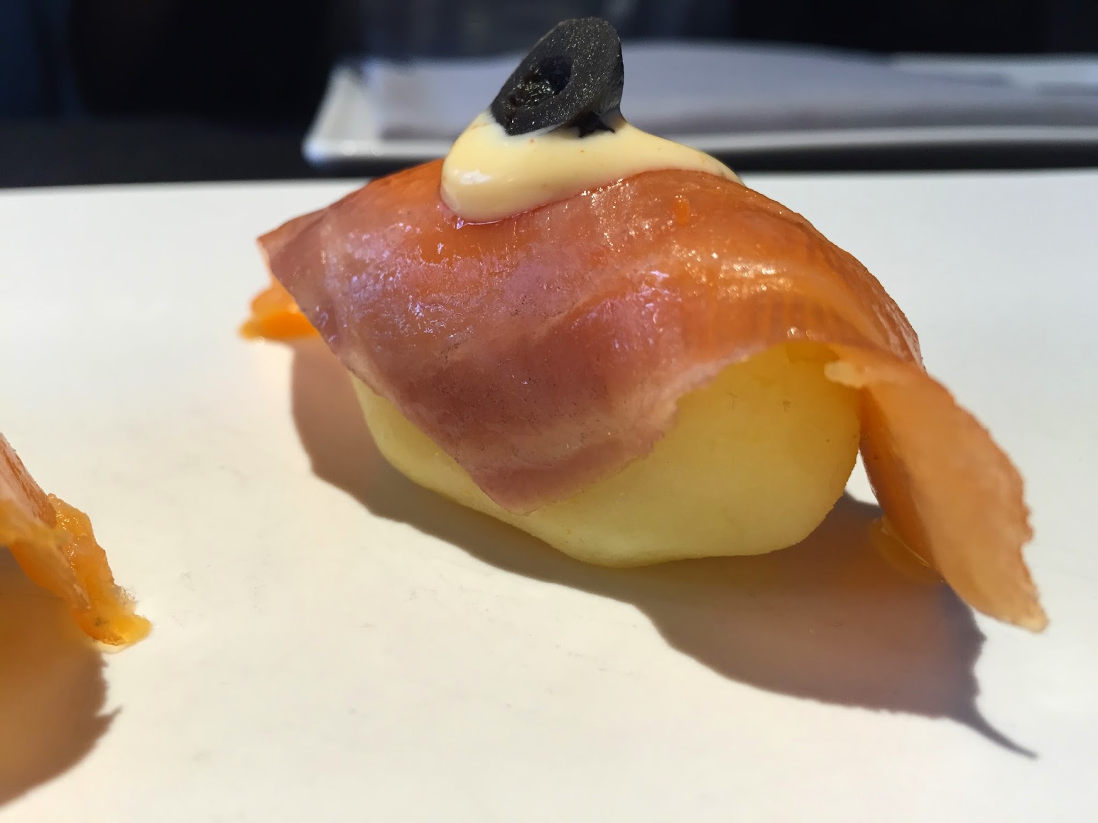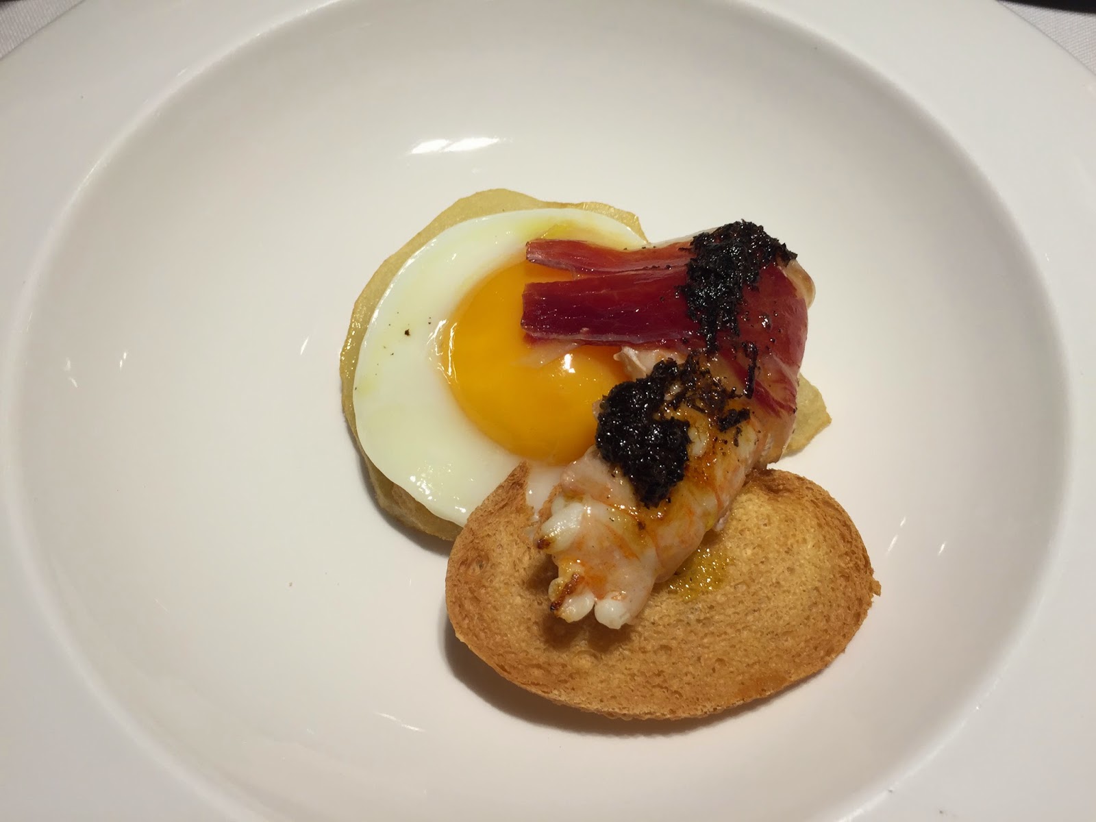 En este caso eran unos huevos con cigala, trufa y jamón ibérico y si mi recuerdo no falla, debajo del huevo también tenía patata. Buena mezcla de sabores, de nutrientes y de alimentos.
