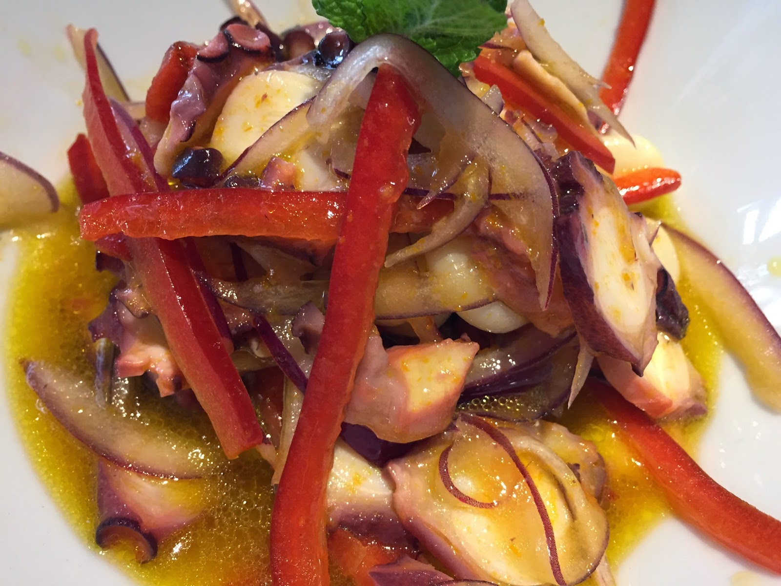 Un sabroso ceviche de pulpo con una más que intensa salsa, y como no estamos en un restaurante finoles, ¡a mojar el pan y a chuparse los dedos!