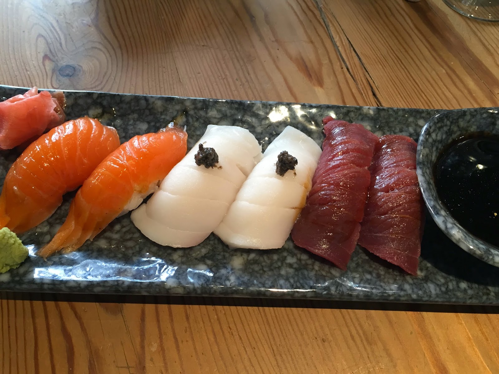 Niguiris de salmón, pez mantequilla y atún con unos generosos trozos de pescado, ¡pero muy muy generosos he de decir! Antes empezamos con un bocado de niguiri de patata y un tataki de tomate acompañado de aceitunas negras y algún fruto seco, así sí.