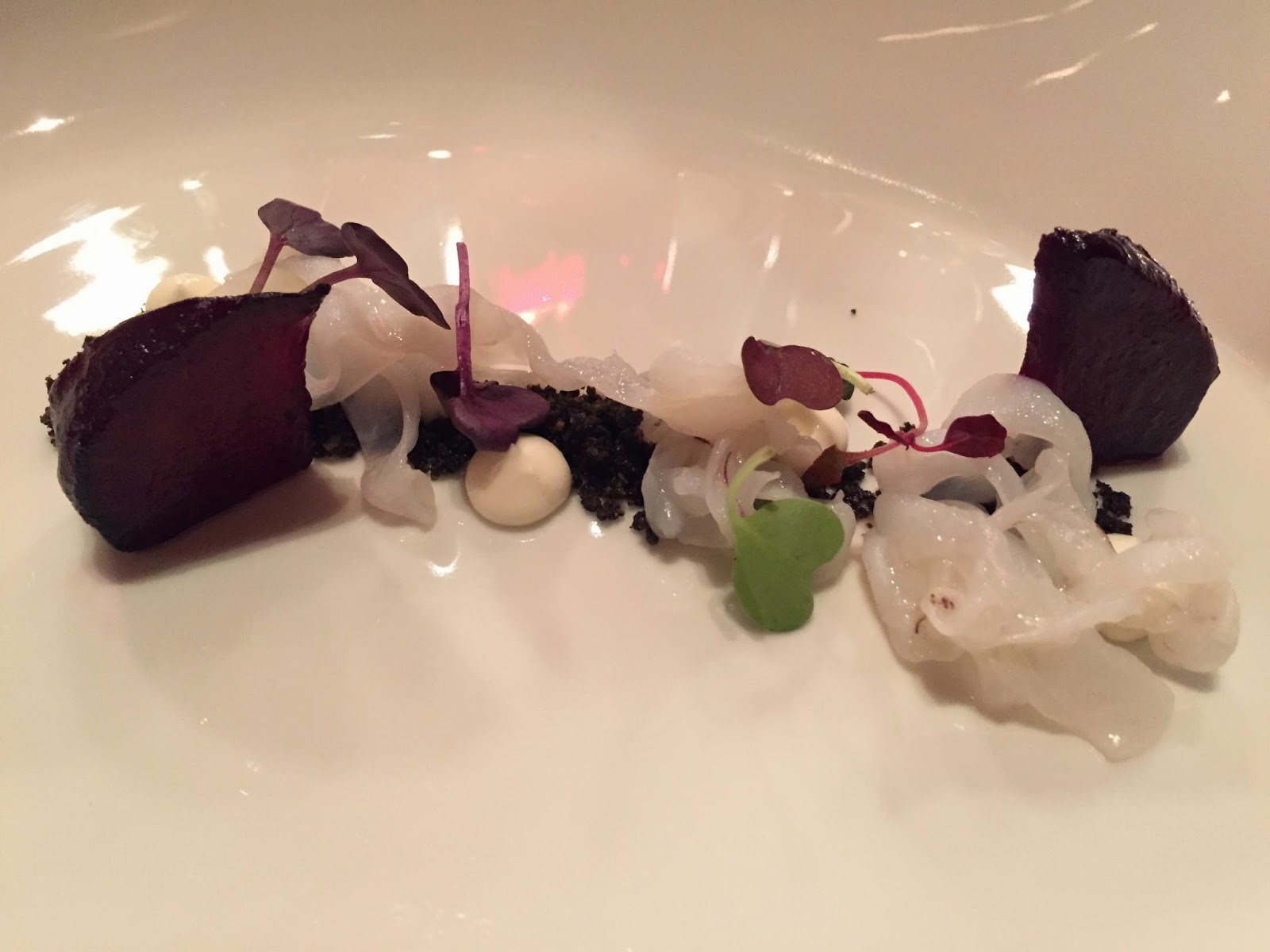 Remola asada, sepia, esfera de yogur y tierra. Muy sorprendente la sepia y bravo por poner remolacha (en trozo) en platos de hoy en día.