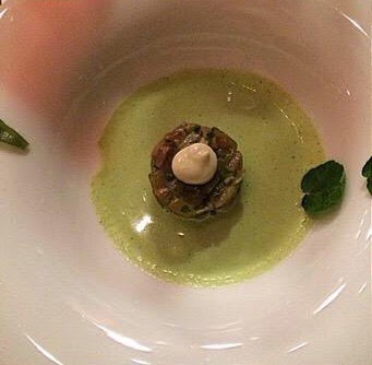 Este plato se llama las semillas. Uvas, cigalas y trozos de aguacate (me sobraban) con un centro de quinoa (bravo por incluirla) y con el jugo de cigalas, ajo blanco y AOVE.