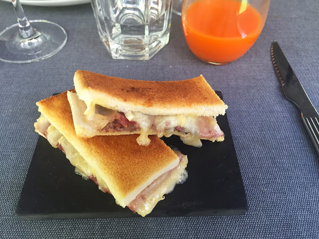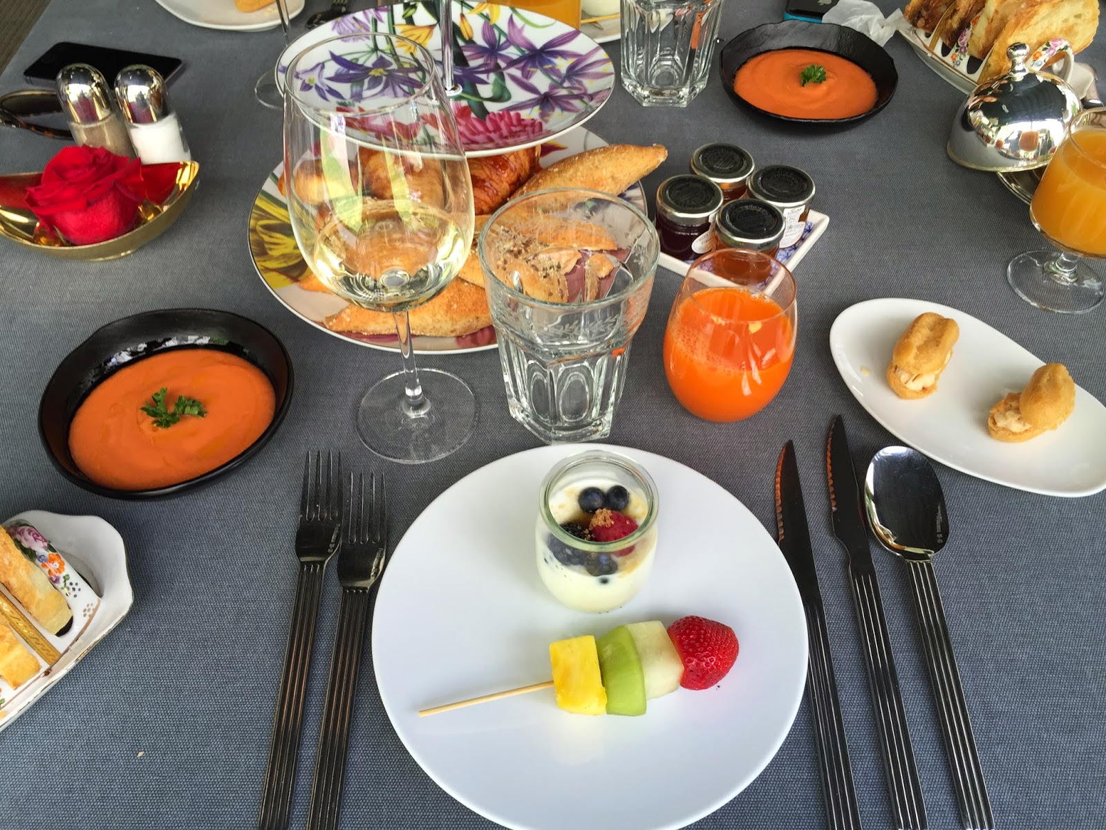 Empezamos con muchas burbujas, un cava hecho expresamente para Ramón llamado Burbujas. Unos zumos tanto de naranja, como el clásico bellini hecho con alcohol y zumo de melocotón. Melocotón el que nos vamos a coger como no empecemos a darle al dulce. Cruasanes y bollos con chocolate, también brochetas de frutas y yogur con frutos rojos, el guiño healthy al brunch y algo que me encanta de vez en cuando, tostadas con mantequilla de la de verdad.