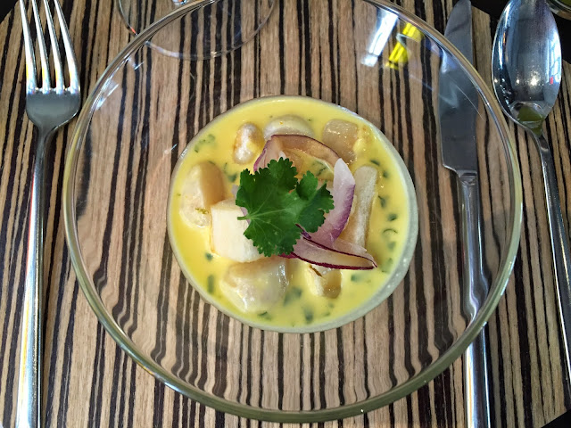 Ceviche de vieira patagónica. Buena salsa y buenas piezas de vieiras. Si otro valor hay que destacar de Matías es su sabiduría con los maridajes, ¡los domina a la perfección! Doy fe de ello.