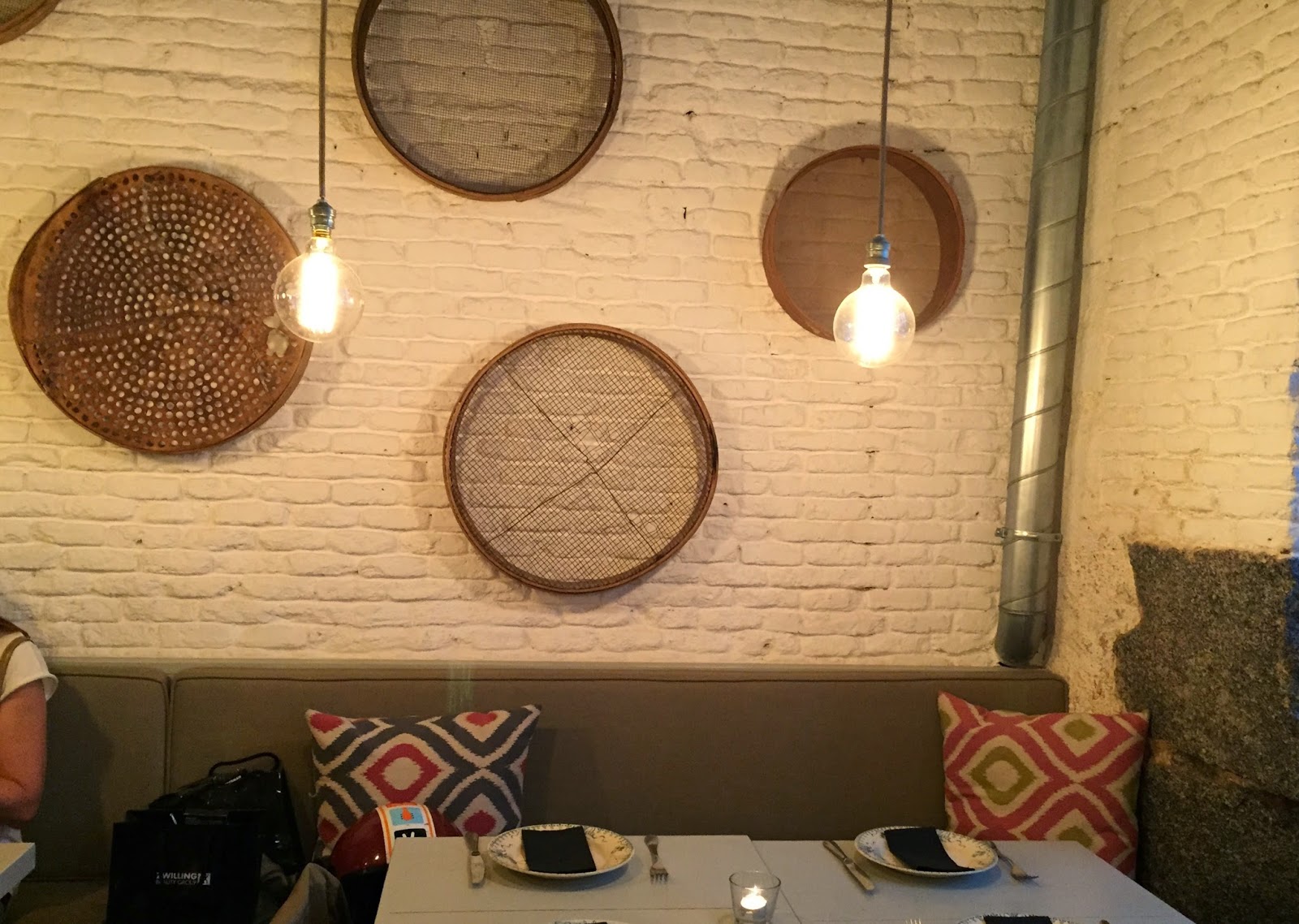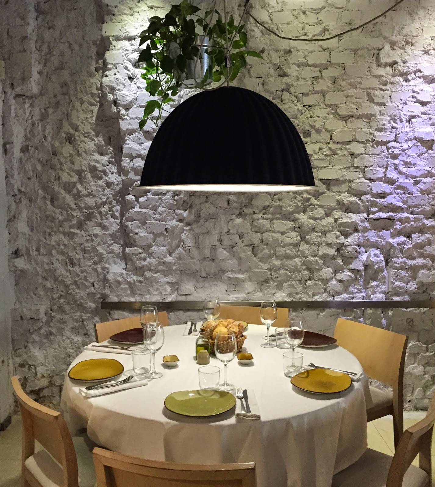 Dentro te encuentras un ambiente tranquilo y desenfadado con mesas circulares (perfectas para conversar) y paredes de ladrillo visto pintado de blanco junto con unos lamparones que iluminan el sitio.