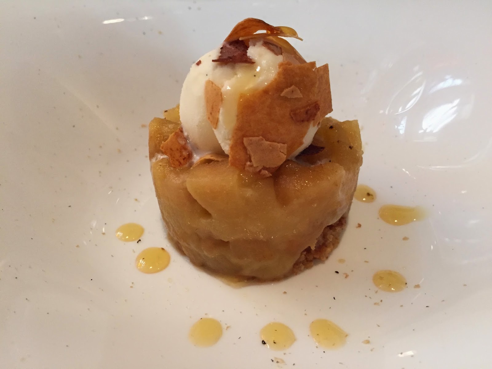 Tat-crumble de manzana, helado de vainilla y caramelo de haba tonka. No soy muy fan de la apple pie ni de postres con manzana...así que aquí no podría ser objetivo.