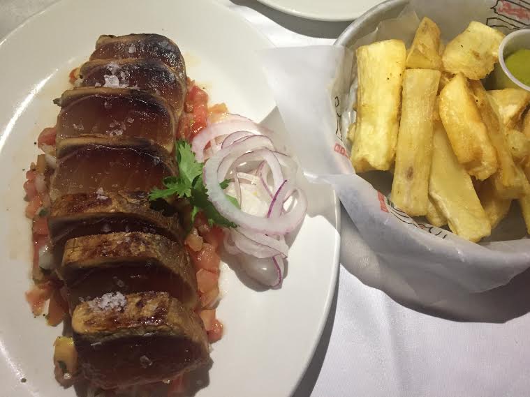 Seguimos con un buen lomo de atún a la plancha hecho tataki con una base de tomate y cebolla picadito, muy bueno. Para acompañar la hamburguesa me pedí yuca frita en vez de patatas. Soy bastante amante de este ingrediente cubano (por lo menos allí se da mucho) y que tiene mil formas de hacerse.