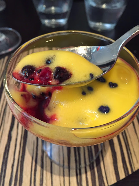 Y de postres, almíbar de frutos del bosque, mousse de mango y caramelitos de violeta. Muy cremoso y con un chute de sabor.