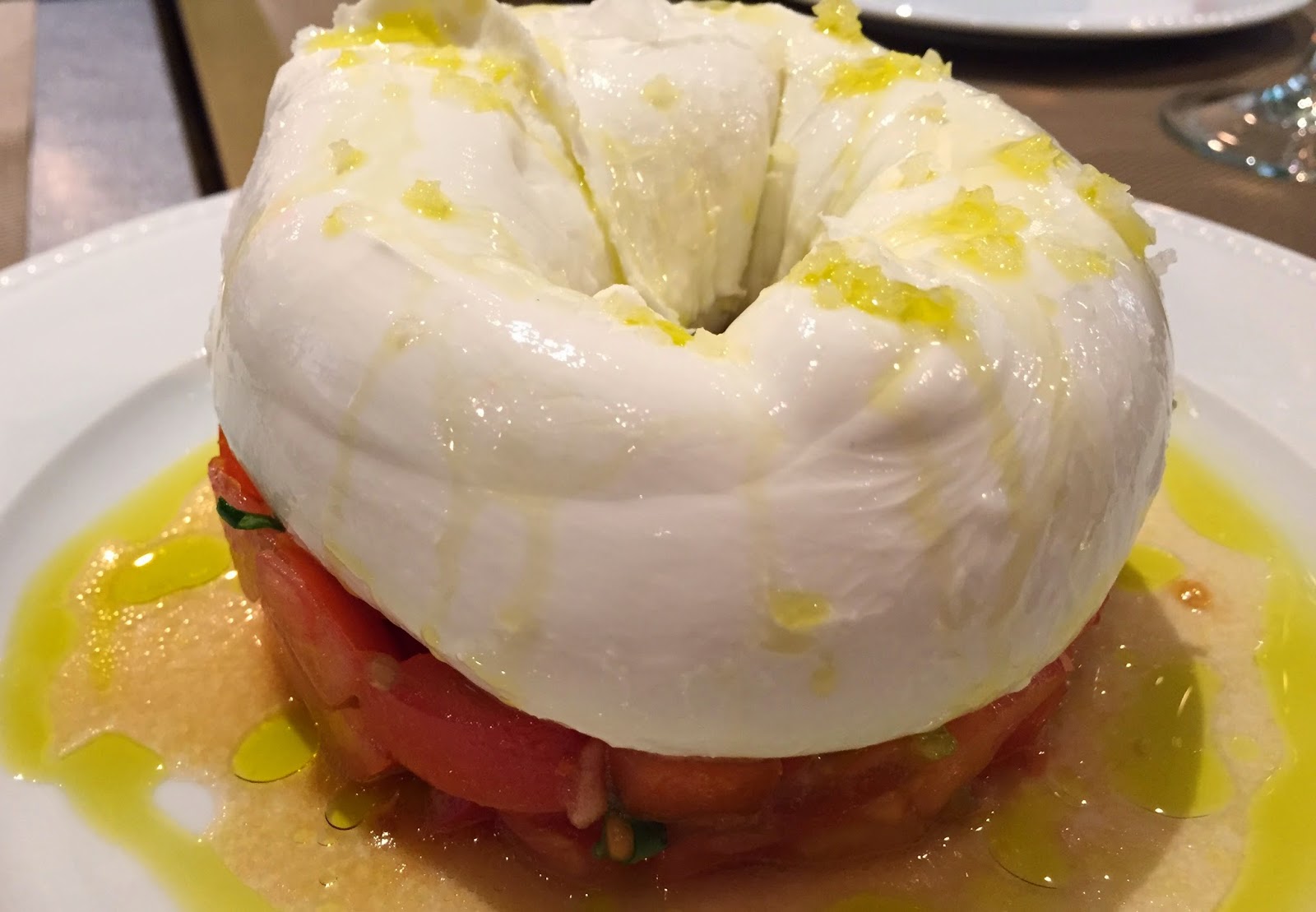 Empezamos compartiendo una mozzarella de búfala (ojo a la foto) sobre un timbal de tomates frescos y un toque de albahaca. Simplemente con el tamaño de esta mozzarella y lo impresionante de la misma, no podría defraudar.
