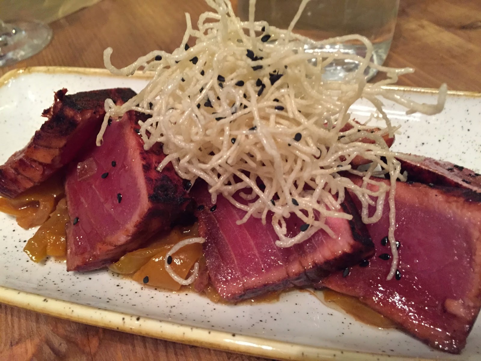 Tataki de atún con patata y sésamo tostado por encima. La cama del plato si no recuerdo mal era de pimiento amarillo. Muy jugoso y perfecto el haberlo adobado.
