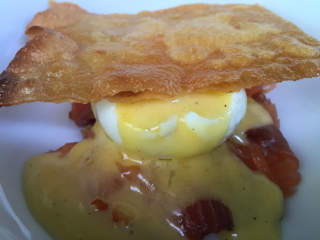 Unos benedictinos no podían faltar. Huevo de los de verdad (gallinas ibéricas de bellota). Una buena materia prima como es el salmón ahumado y la salsa perfecta. Ramón le puso sombrero al plato para darle ese toque "crunchy".