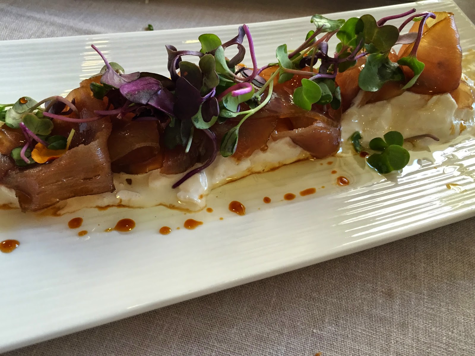 Atún rojo ahumado templado, burrata fresca y salsa teriyaki. ¡Por fin se mezcla la burrata con algo! Me gusta que no tome tanta importancia y se ponga como acompañamiento, porque para muchas personas llega a ser insípida, y ponerla como protagonista en un plato puede ser arriesgado. Me encantó la combinación.