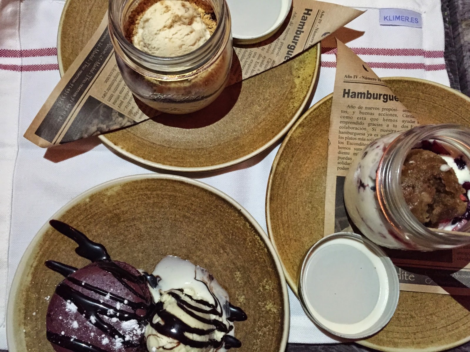 De postre para compartir una amplia variedad donde los ingredientes que primaban era el chocolate, frutos secos, helados de vainilla e incluso frutos del bosque en una rica tarta de queso.