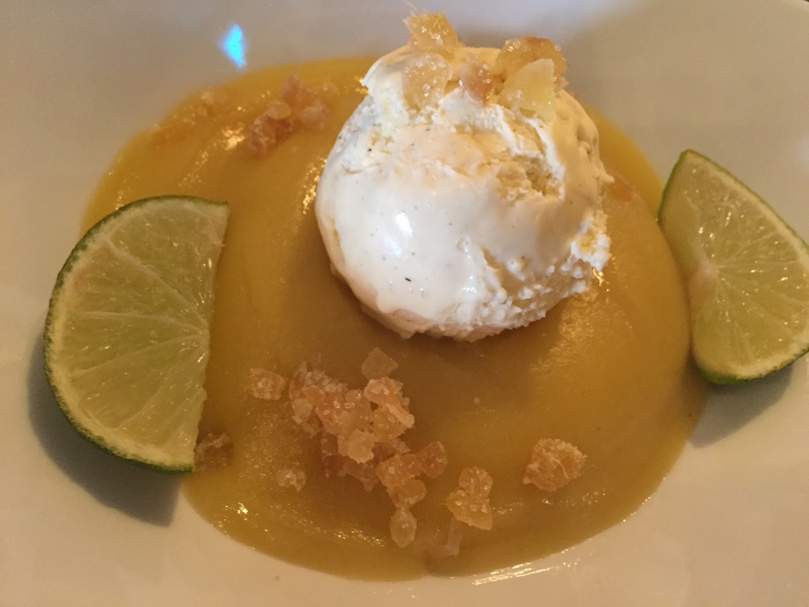 Acabamos con postre también refrescante, lima pie con helado de coco y confitura de gengibre. Con lima mucho mejor, ¡más ácida!