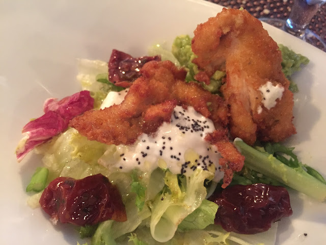 En lo que respecta a ensaladas, nos tomamos una con base de lechuga (yo lo cambiaría porque no soy yo muy de lechuga, desde el punto de vista nutricional), con pollo especiado, tomates secos y una salsa de yogur con semillas de amapola. Bien por los ingredientes pero cambio la base por espinacas por ejemplo, ahí va mi sugerencia.