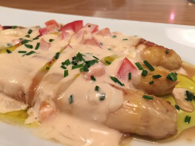 La merluza con mayonesa de crustáceos estaba muy buena ya que la merluza era un buen lomo fresco y las gambas prácticamente sin hacer junto con la salsa hacían buena mezcla, potente en sabor.