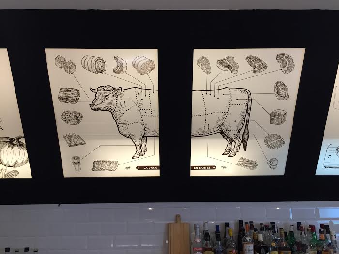 Por dentro un local relajado de estética donde las cajas de verduras te las puedes encontrar como decoración por todo el restaurante, al igual que las fotografías con las partes de la vaca, siempre me ha encantado este tipo de fotos tan educativas e ilustrativas.