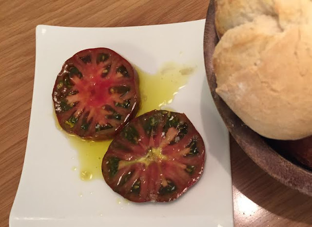 Bueno, apoyamos los culos en el asiento y empezamos a mover el bigote. Tomates de Almería, carnoso, con un buen chorrito de aceite de oliva virgen extra...un buen comienzo.