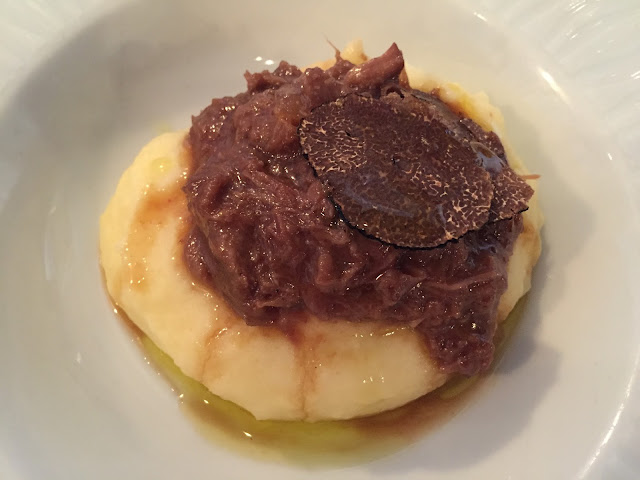 Rabo de toro estofado al vino tinto, desmigado sobre puré de patatas trufado. Era un plato de lo más jugoso, un guiso de toda la vida, de carne, con su salsa y su patata, y en este caso también la trufa.