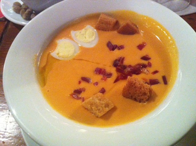 Y si seguimos con lo típico, pues un exquisito salmorejo, con sus picatostes, con su jamoncito, sus huevos de codorniz...en su punto, consistente como debe ser y con un buen chorrito de aceite.Venga me mojo, ¡el mejor salmorejo que he probado!, ¡¡¡que siga corriendo el tinto de verano!!!