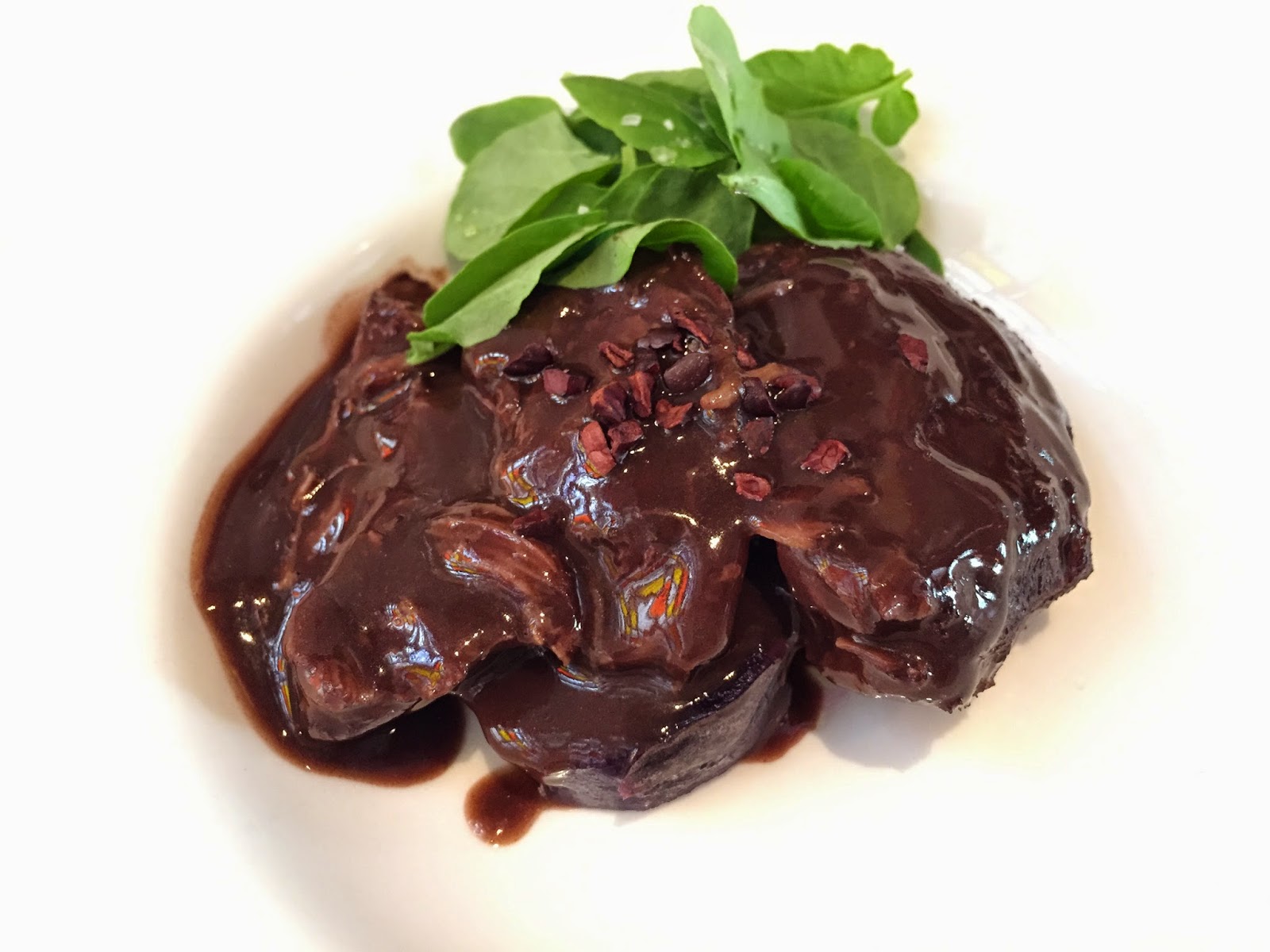 Carrillera ibérica con cacao de la selva. ¿A quién se le ocurre rallarle cacao a una carrillera? Lo sorprendente es que no sabía nada dulce, notas amargas que fusionaban con la jugosidad de la carne.