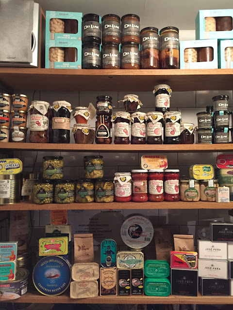 No hay cosa que más me guste en un restaurante, que una buena mesa de madera maciza. La típica mesa que se usa en las matanzas (ahora que estamos en época), que perduran durante décadas y que resisten a cualquier tipo de climatología. Si a eso le añades un lugar pequeñito, lleno de botes y cosas, y donde sirvan una buena materia prima, ya soy feliz. Además ahora en diciembre apetece encerrarse en sitios así, cálidos y agradables donde resguardarnos del frío, y sino te lo compras y te lo llevas a casa, que para algo es también tienda, aparte de taberna.