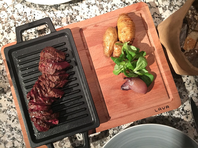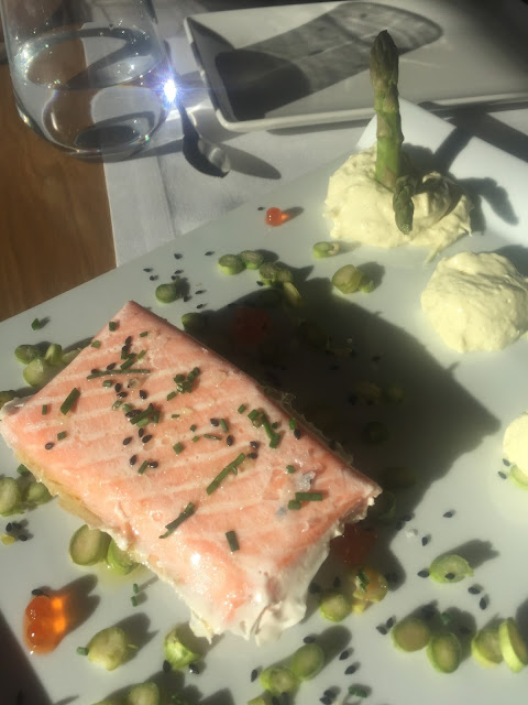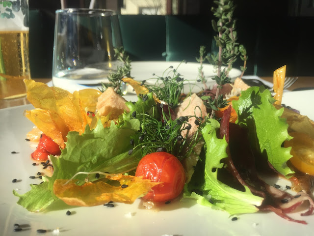 ¿QUÉ? Su maravillosa ensalada de ventresca, fresca y colorida como podéis ver en la foto. Un salmón hecho a baja temperatura que se deshace y ahí metemos omega 3 por un tubo, cochinillo deshuesado con un toque crujiente por parte de las migas de los frutos secos. Los postres son lo básico como un suflé de chocolate y bola de limón pero con algo más especial, no olvidéis probarlos.