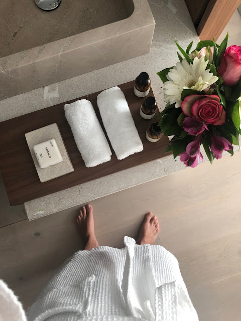 Salí del masaje con la cara empanada, con esa marca circular alrededor de la cara y prácticamente con los párpados pegados...de verdad, que en Es Princep te saben cuidar como en casa. Se nota en los detalles, en eso que de primeras no te das cuenta pero que te queda en el recuerdo para volver. En ese olor al entrar en la habitación, en la textura de las sábanas, en la luz que entra y se refleja sobre la butaca de terciopelo, en el suelo de hormigón de la ducha, por no hablar de la cascada por la que sale el agua...en fin, ¡mejor que en casa!