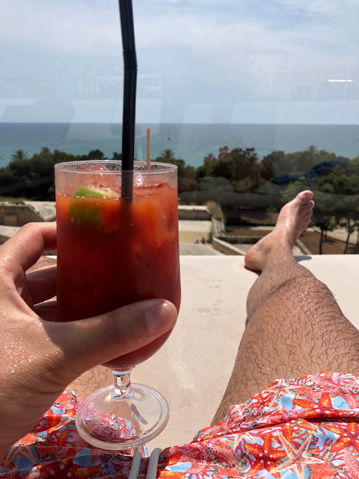 Si el sufrimiento y esfuerzo estaba siendo superlativo, sólo me faltaba subir a la azotea a tomar el sol y darme un baño con vistas a la Catedral de Palma. Pues dicho y hecho, subí a mi habitación a ponerme el traje de baño, y casi con la chancla por el pasillo, me planté en la última planta. Un día soleado, una tumbona y una piscina. Pero no, mucho sufrimiento, me falta algo...¡ah sí, mi zumo de tomate! "Tus deseos son órdenes", y es que en cuestión de segundos lo tenía en mi mano, disfrutando de una lectura rápida de la prensa, del sol y de fondo el mar.