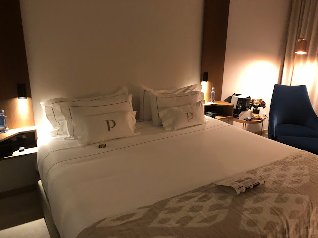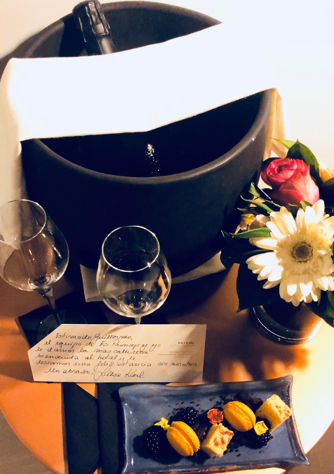 Tras unas risas y un parlao' con la gente, subí a la habitación, ¡qué habitación! Un baño semi abierto, una cama de 2x2 (que no me puede gustar más, eso y las almohadas), y un detalle de una botella de champán con unas frutas...madre mía, y eso que era de noche, que de día con la luz y las vistas debía de ser un espectáculo.