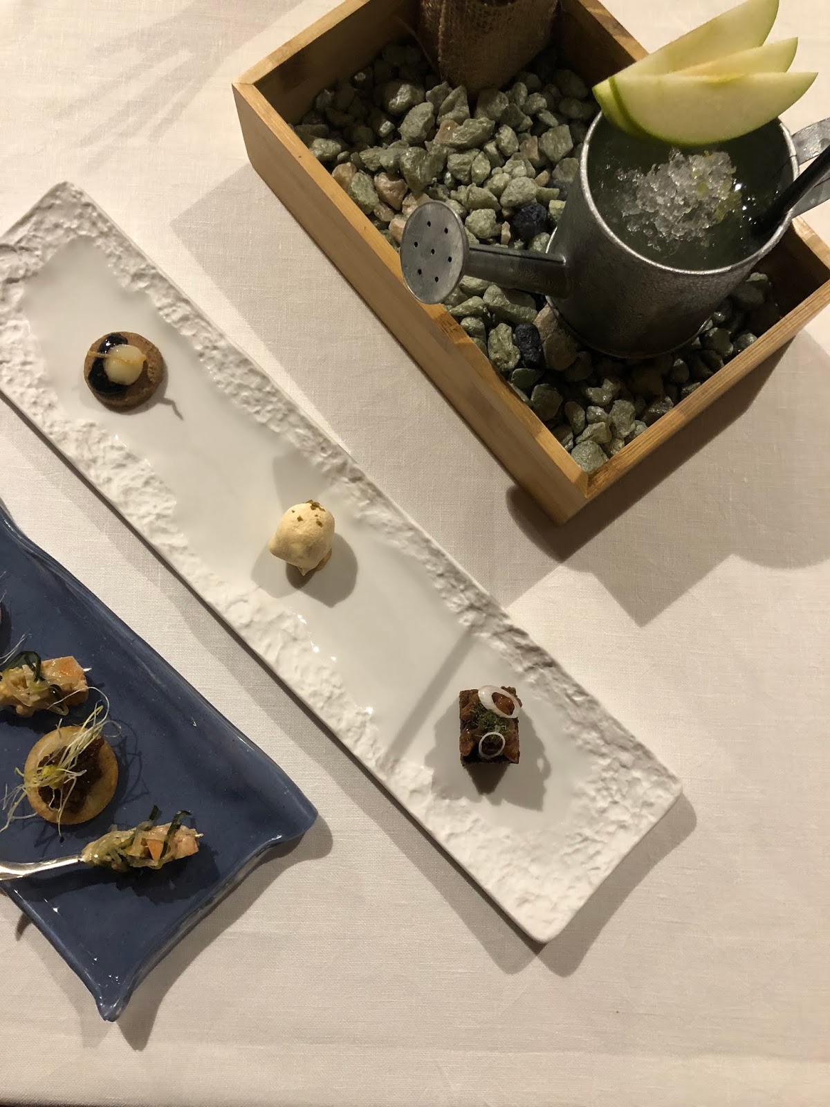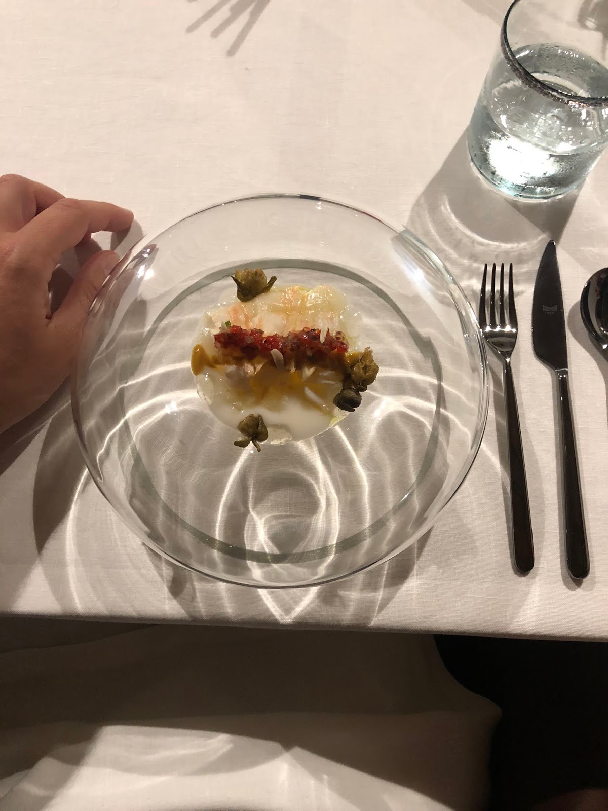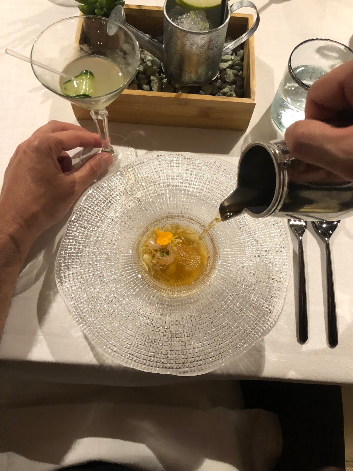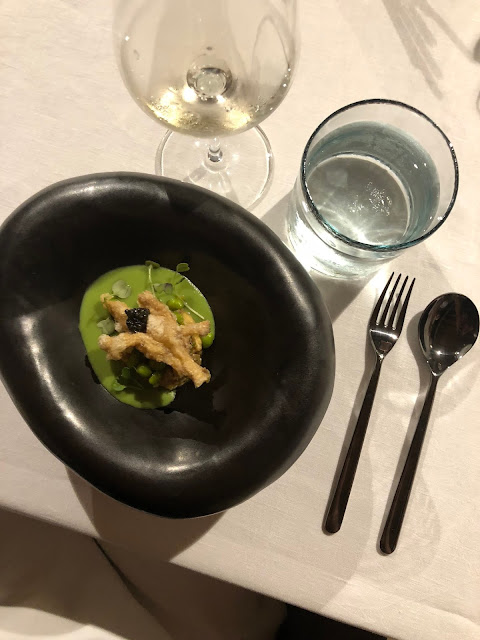 Continuamos con un pilpil de langosta con una presentación de lo más futurista. Me recuerda a algunas edificaciones ovaladas que hay en alguna isla de Japón (ahí lo dejo para algún arquitecto friki que se pueda sentir identificado). Guisante tierno con pata de pollo deshuesada con caviar. Este plato me flipó, porque conseguir una textura del guisante prácticamente imperceptible y que sepa rico es complicado. El crujiente de la pata de 10.