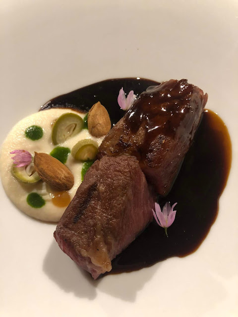 Langosta mallorquina con uno de sus caldos. Bacalao con verduras y para rematar la jugada presa de cerdo negro acompañada de una salsa de soja y almendras. Bastante jugoso y el toque de crujiente de la almendra es fundamental, y más si hablamos de un plato fuerte.