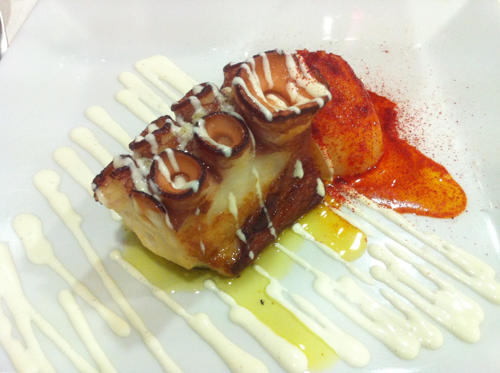 A estos 5 primeros (que me los comí yo solo) hay que añadirle 2 segundos. Una merluza ex qui si ta, repito según mi padre, ex-qui-si-ta con salmorejo, cebolla caramelizada y setas por encima. Estaba buena sí, pero a estas alturas ya costaba comerse cualquier cosa.